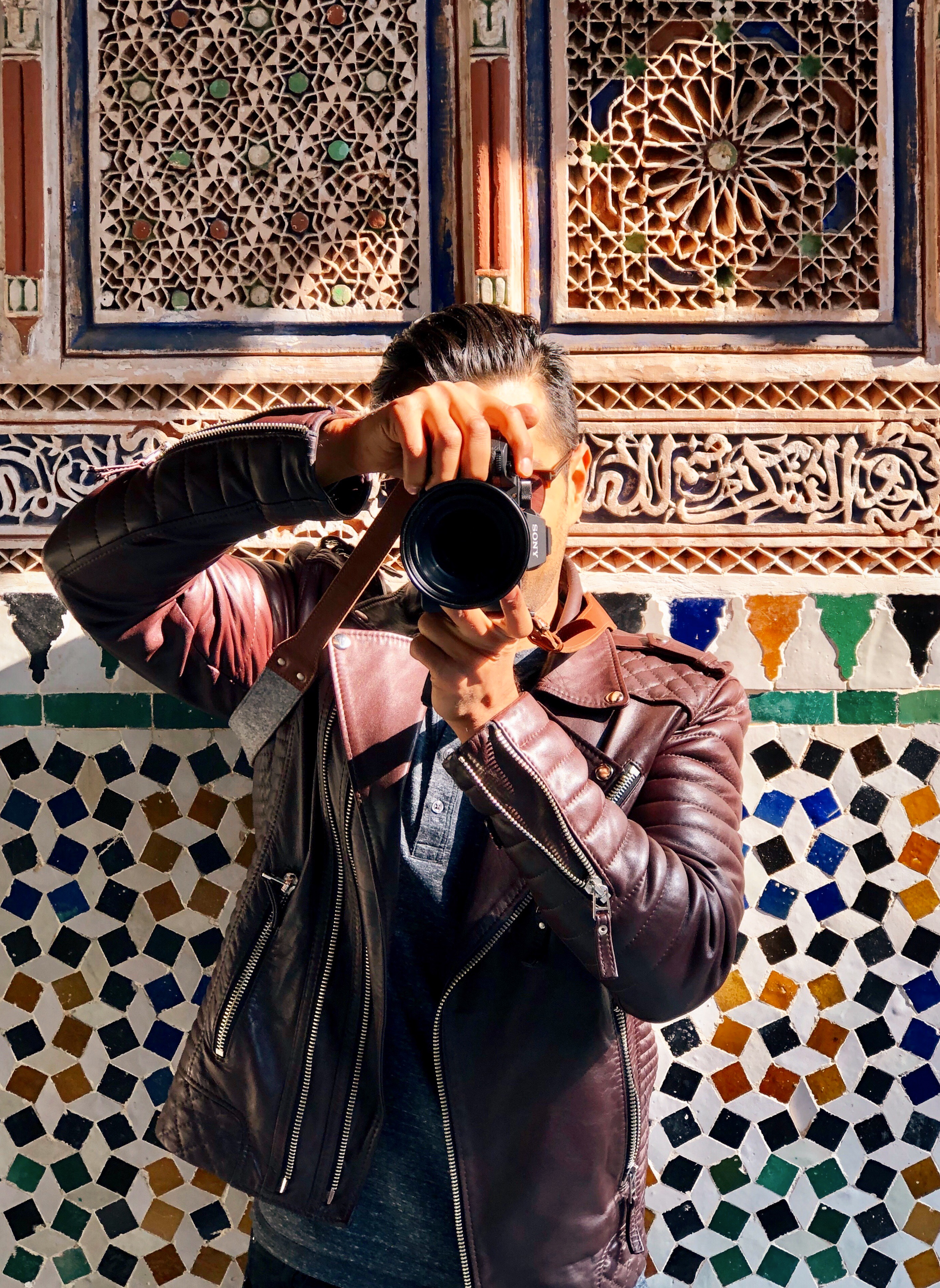 December 29th, 2018: The Bahia Palace is one of the main attractions in Marrakech. If you want to see this, I’d highly recommend getting there early, as opposed to rolling in at noon like we did. The line to buy a ticket was 30 minutes long, and local guides would keep cutting it to get their tickets first. Anyway, once you do get inside, the palace is quite nice. Lots of patterned walls, arches, skylights, and windows with colored panels. At one point, I asked my girlfriend to stop for a picture. I leaned back against a wall behind me to take the shot. Suddenly, she raised her phone and took a photo of me taking a photo of her: