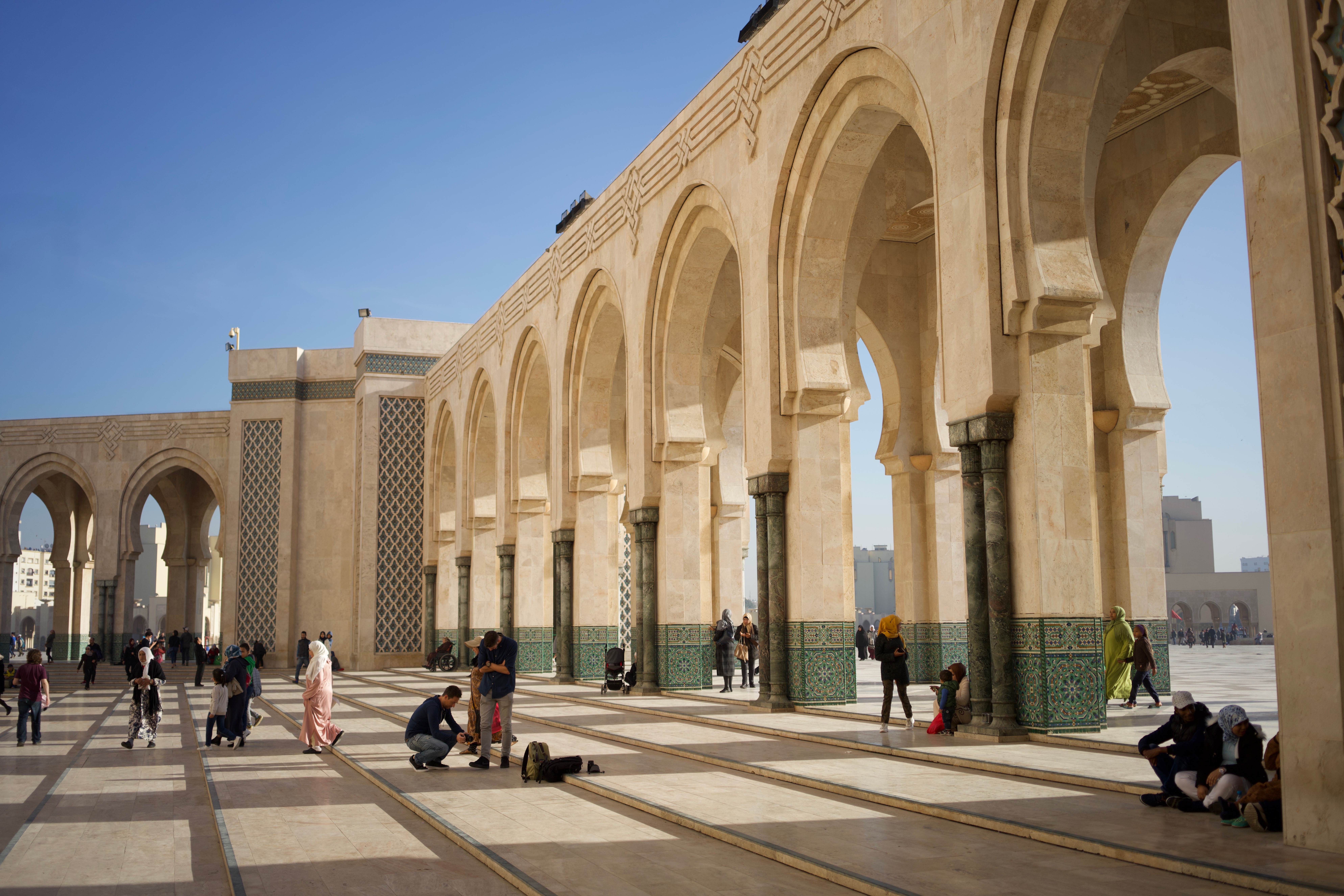 December 22, 2018: Our first stop in Morocco was Casablanca. We had been told that there isn’t too much to see over here, so we had only one evening. Our hotel was just a block away from the Grande Mosquée Hassan II – the largest mosque in Africa. It was around 5pm, and we had to stay awake for a few more hours to get over the jet-lag, so we walked over to check out the mosque. People were there with their kids, just hanging around and enjoying the sunshine. As we got to the mosque, the sun had settled down over the city and was shining directly through the series of arches that surround the mosque: