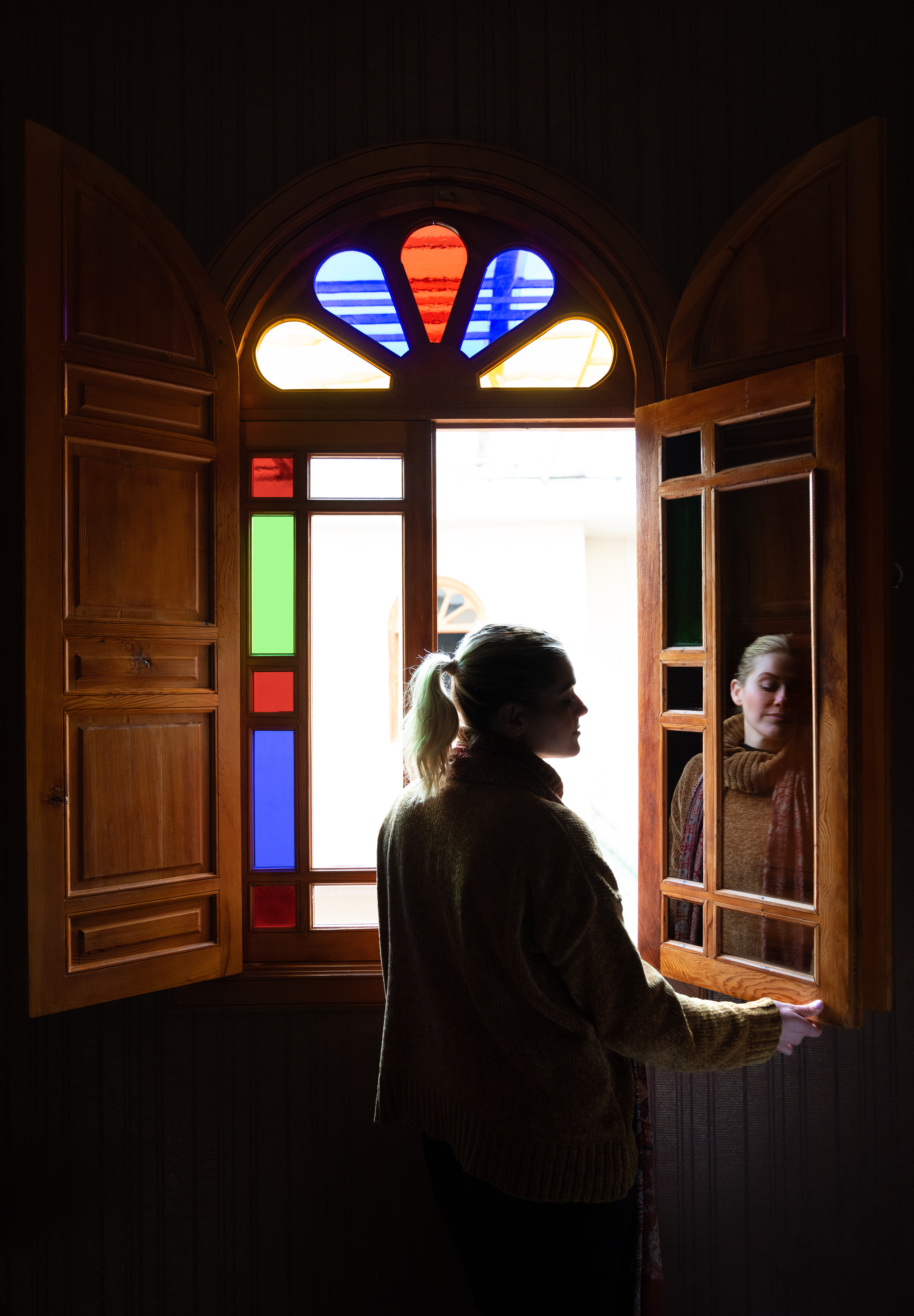 December 24, 2018: We stayed at a riad in Fes. A “riad” is a traditional Moroccan house with a central courtyard/garden, often characterized by intricate designs and patterns on the walls and windows. If you ever visit Morocco, I would recommend staying at a riad (you can book them using Expedia, for example). Our room at Riad Andalib in Fes had a very nice window with colored panels, that just happened to look over the courtyard. The skylight over the courtyard shone through the colored panels, illuminating the opposite wall inside our room in multiple colors. Sensing some photographic potential, I asked my girlfriend to stand in front of the window. It took a few attempts before she stopped laughing and posed seriously: