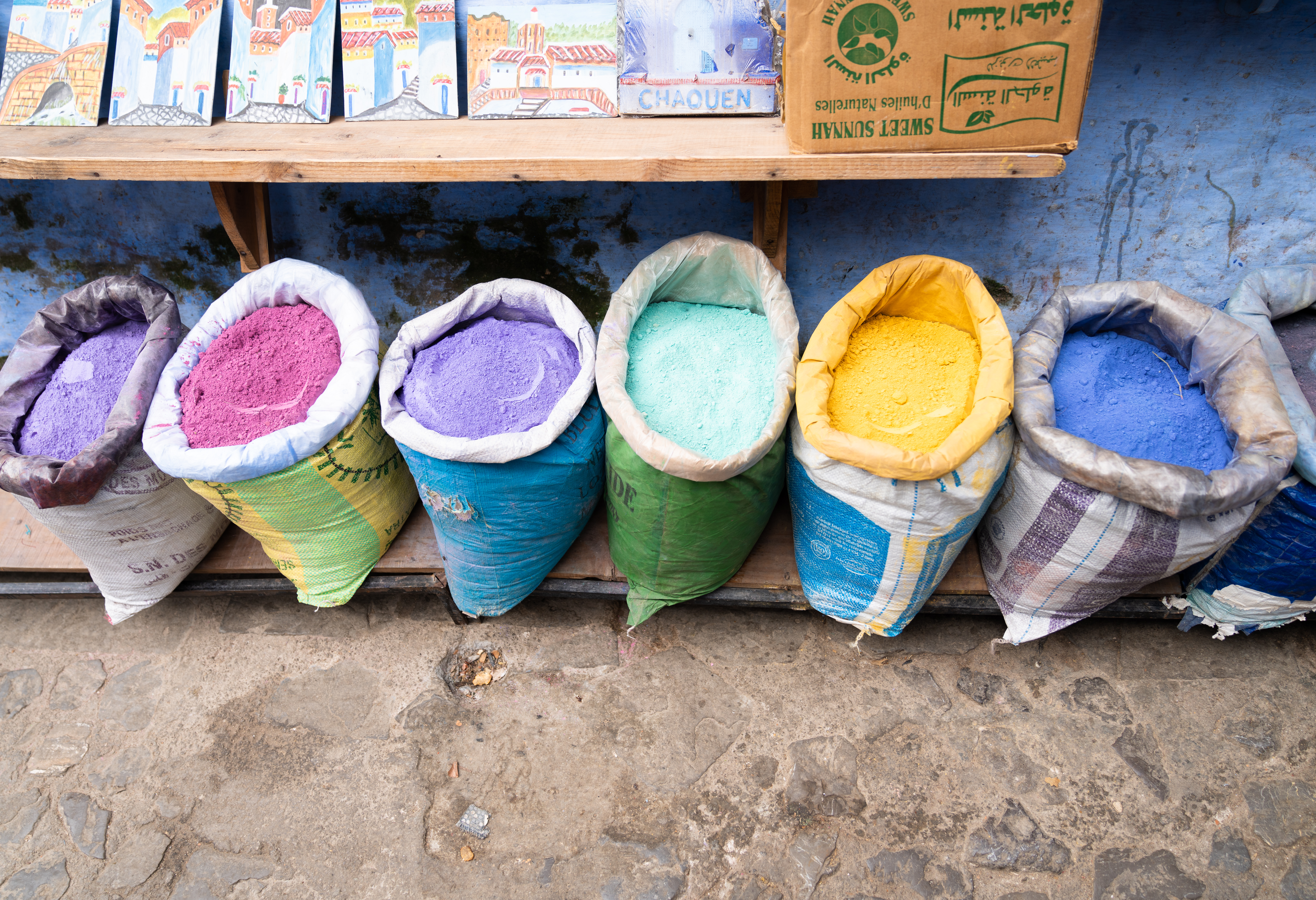 December 25, 2018: After a 3.5 hour taxi ride from Fes, we arrived in Chefchaouen, a quaint little mountain town where everything is painted blue – the houses, stairs, walls, doors, you name it. Shortly after arriving, we walked through the tiny old town alleyways in search for Chez Hicham, a restaurant that we had heard had a nice rooftop. We took our time getting to it, because literally everything around us was begging to be photographed. A few stores had bags of colored powder lined up outside, which stood out even more given all the blue surrounding us: