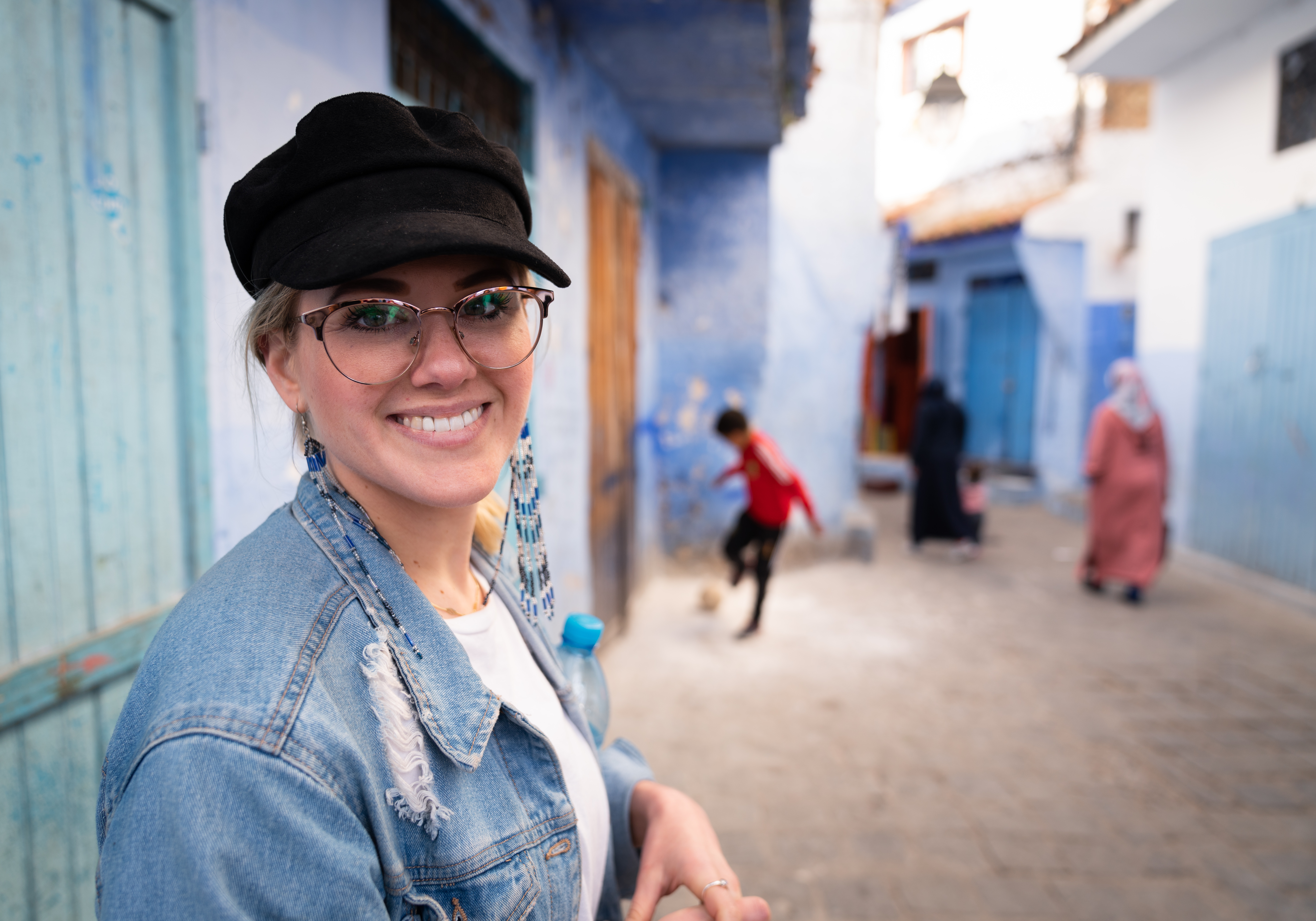 December 25, 2018: My girlfriend posed for the camera somewhere among the blue alleys of Chefchaouen, and got photobombed by a little kid playing football (soccer, if you’re American):