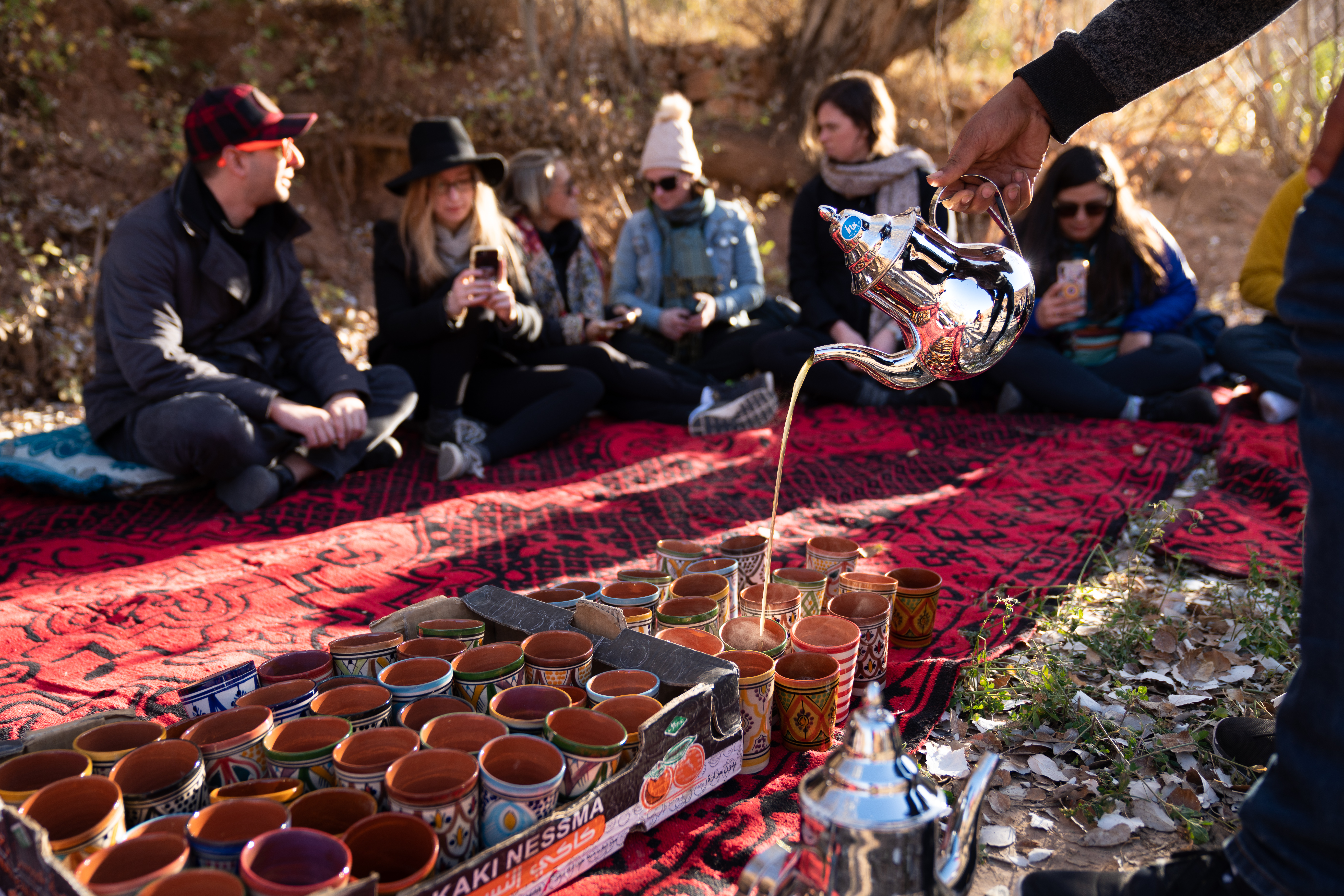 December 30, 2018: Our next destination after Marrakech was Dades Valley, which is sort of like the Grand Canyon of Morocco. After a 5AM wakeup, and a 6AM departure, we eventually arrived at the valley around 2PM. The road snaked up and down the cliff face as it made its way through the valley, overlooking the river that cut through it. We stopped at some point on this road, and our guide, Adil, asked us to follow him off the road, and down to the river. We had no idea what to expect and we started hiking down over the rocks. When we got down to the river, we discovered that a nomad and his family were staying there, and had agreed to host us for lunch! Carpets had been laid out for us, and the smell of warm food filled the air. We saw our hosts cooking over a little fire, and sat down on the carpet to wait. While we waited, one of them poured out some traditional Moroccan tea to warm us up: