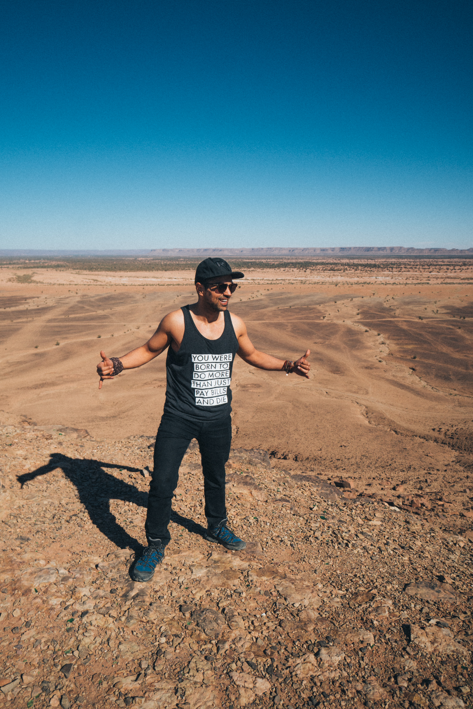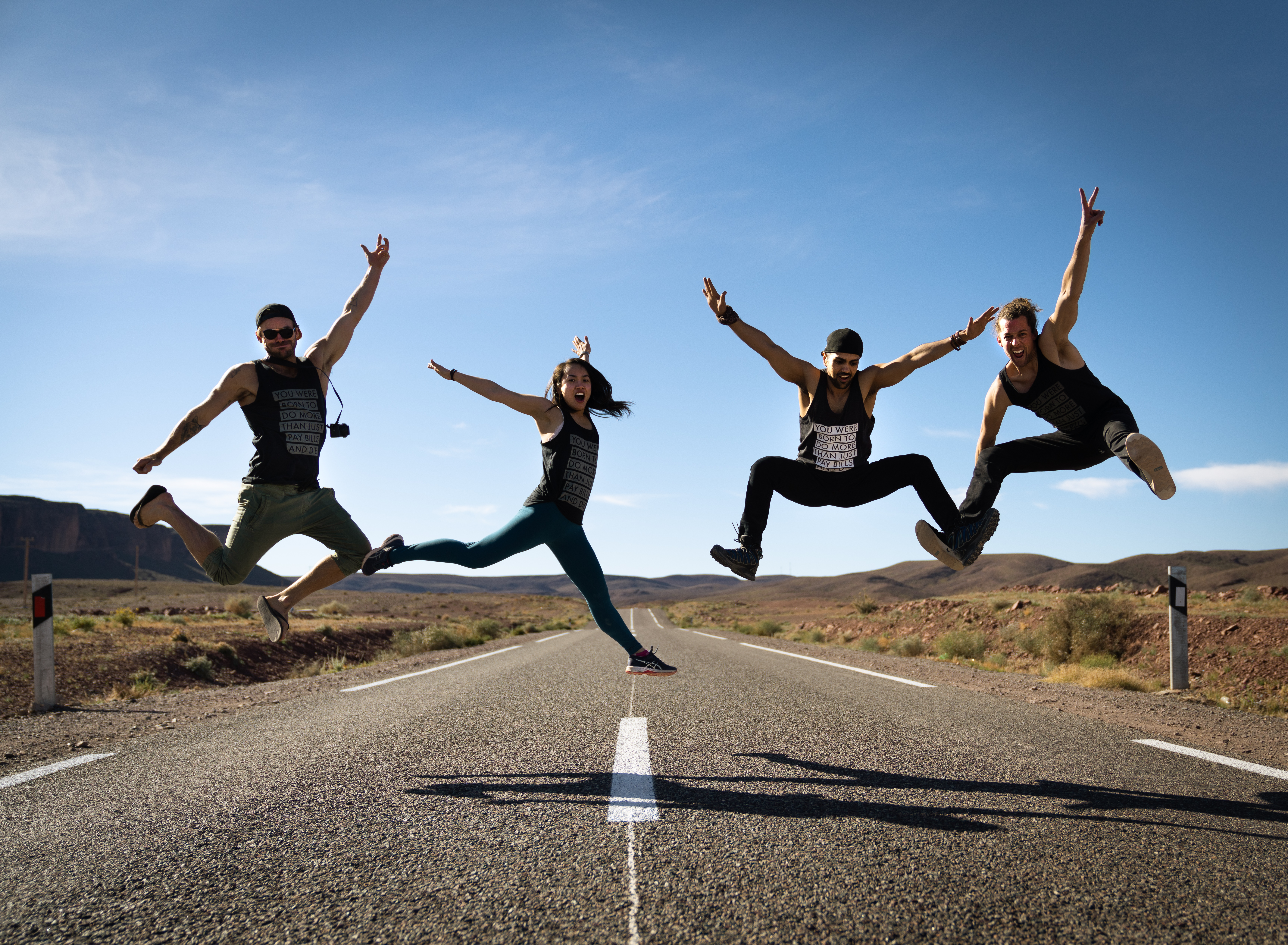 January 3, 2019: As we drove out towards Agadir to surf for the next two days, we went past (what looked like) an abandoned gas station on the highway. It looked strangely non-Moroccan, perhaps even American. Naturally, we pulled over. Out guide informed us that this was actually a set for the movie “The Hills Have Eyes”, which is a horror movie. Everyone instantly went about taking pictures of all the scary objects and mannequins that were still lying around the gas station. Four of us decided that the middle of the highway would make for a much better photograph, especially if we all were airborne. The tank tops read “You were born to do more than just pay bills and die”: