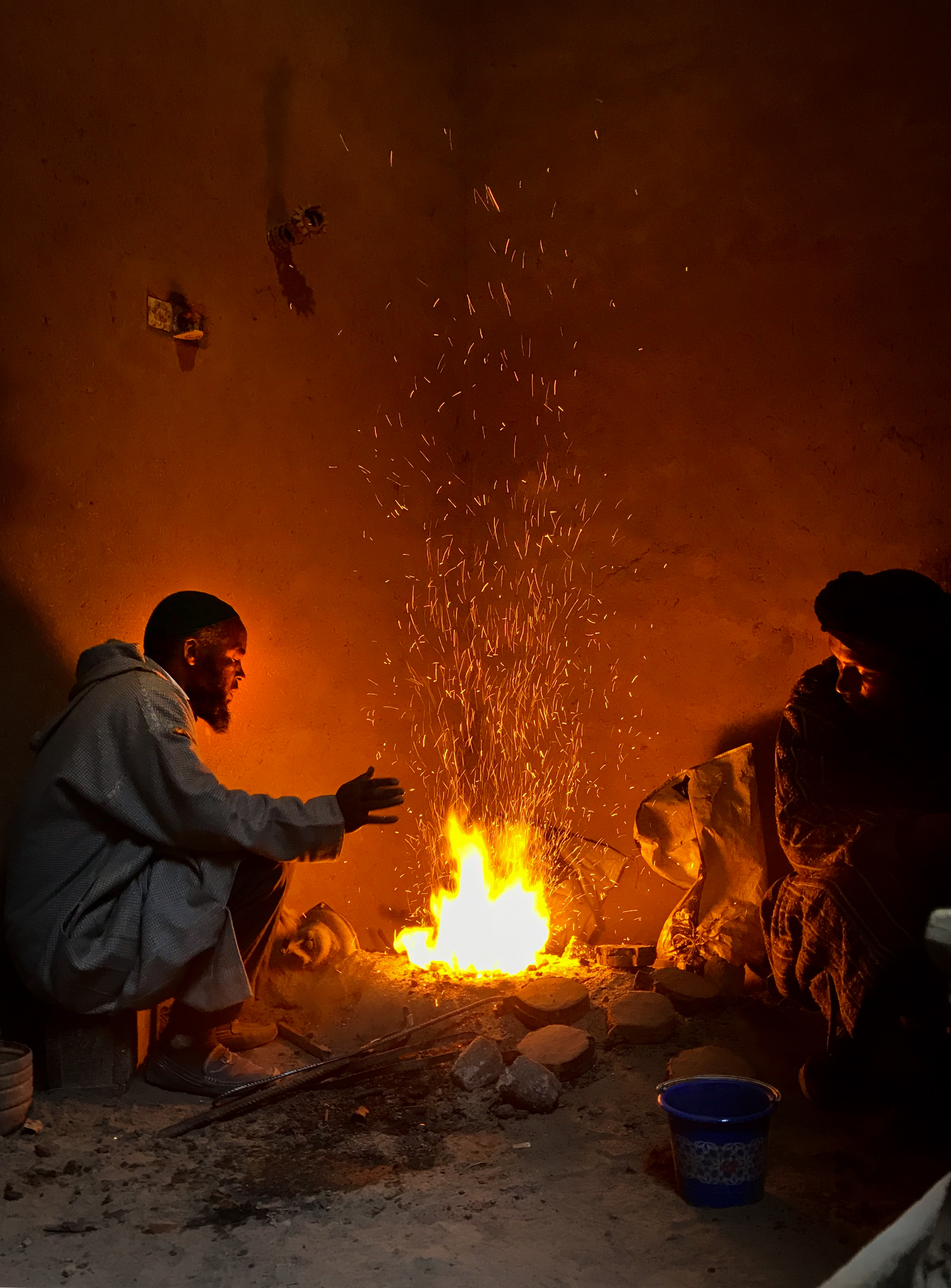 January 1, 2019: Still in Amazraou, we walked into a local jewelry store that sold assorted pieces of silver jewelry. While explaining the meaning of certain symbols on a trinket, the owner offered to show us how it was made. We first walked into a foundry, where two men were making molds that would eventually be used to shape molten silver. Next, we walked over to another room where one man was actually melting silver over a small fire. There was a white-hot container sitting in the fire, presumably containing the silver that would soon be in a liquid state. The owner sat down, and took over. He cranked up the fire a notch. Sparks flew into the air. Everyone looked at the glowing container that turned brighter, and whiter. I sat down, and raised my camera: